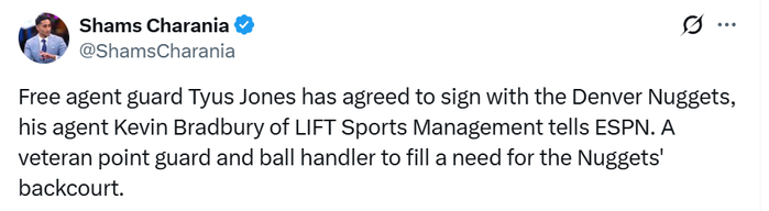 名记Siegel跟进报道称,琼斯与独行侠达成买断,是想加盟一支具备季后赛竞争力的球队,并在球队中担任替补贡献者。如今他得到了这样的机会 —— 将在掘金担任贾马尔-穆雷身后的主要替补后卫,这与2023年雷吉-杰克逊在掘金的角色相似。